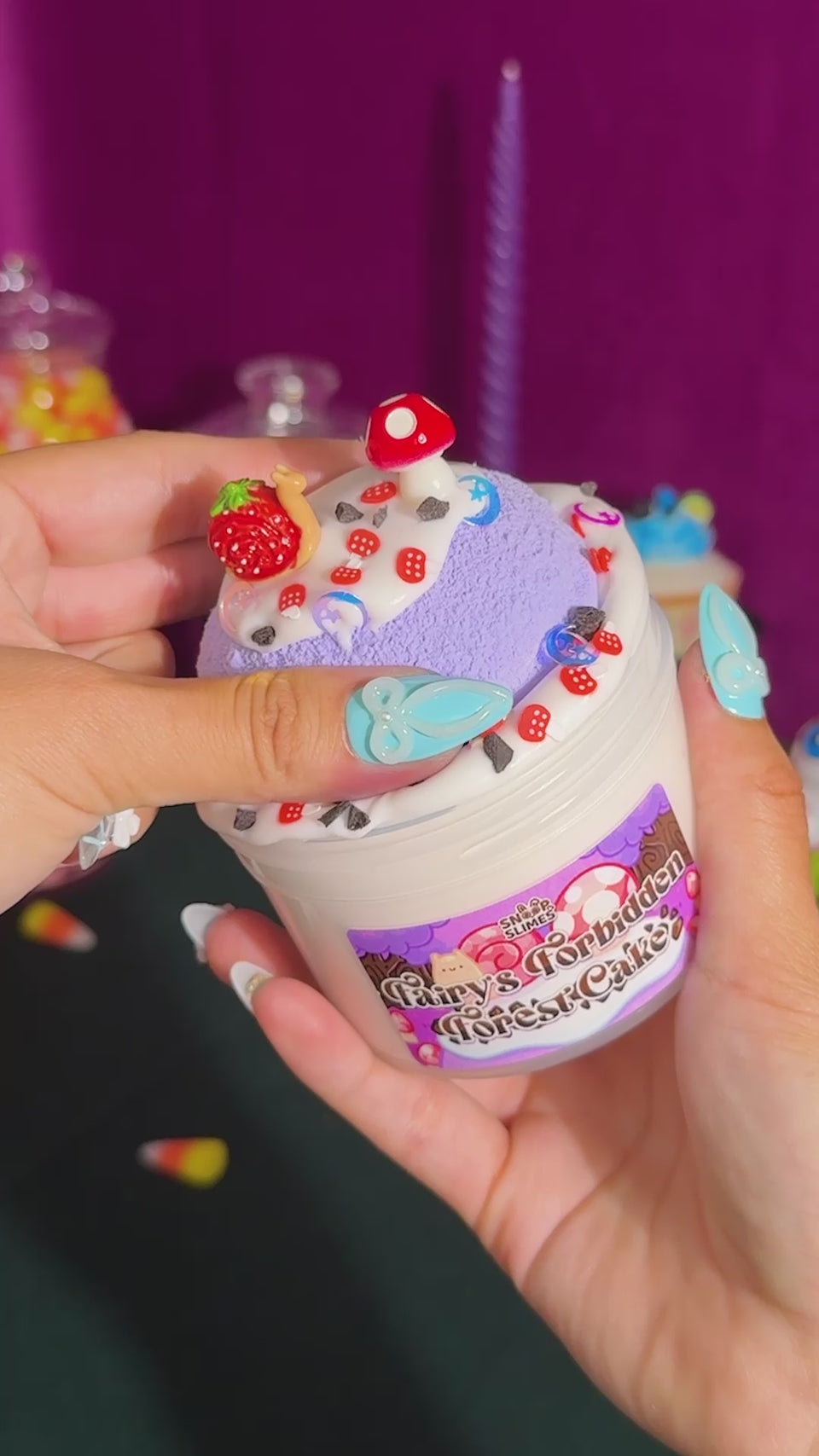 Texture: This slime features a DIY butter base that comes with a purple dome cake clay add-on with forest-themed charms and sprinkles to assemble with! Once it is mixed, it becomes a soft and sizzly slime that is great for squishies.
