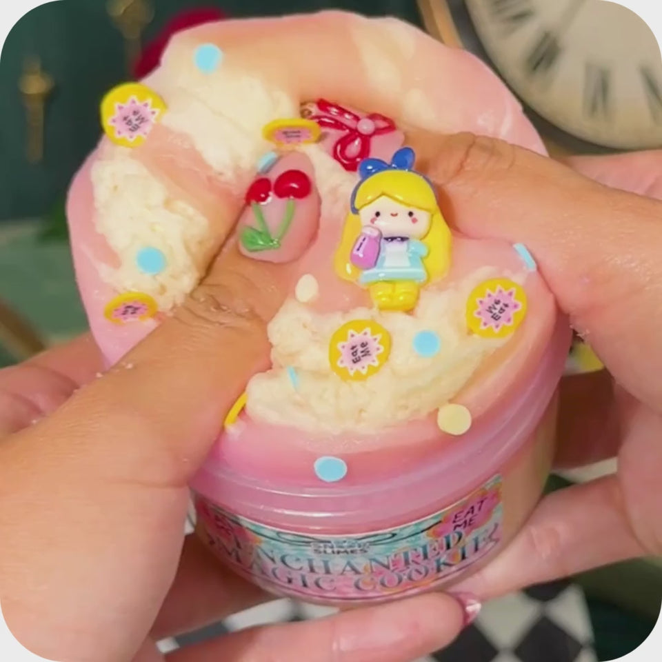 Texture: This slime features a duo-toned hybrid cloud x icee that comes with Alice in Wonderland-inspired charms and sprinkles to decorate! Once mixed together, this slime becomes a sizzly and buttery texture that's satisfying to play with.