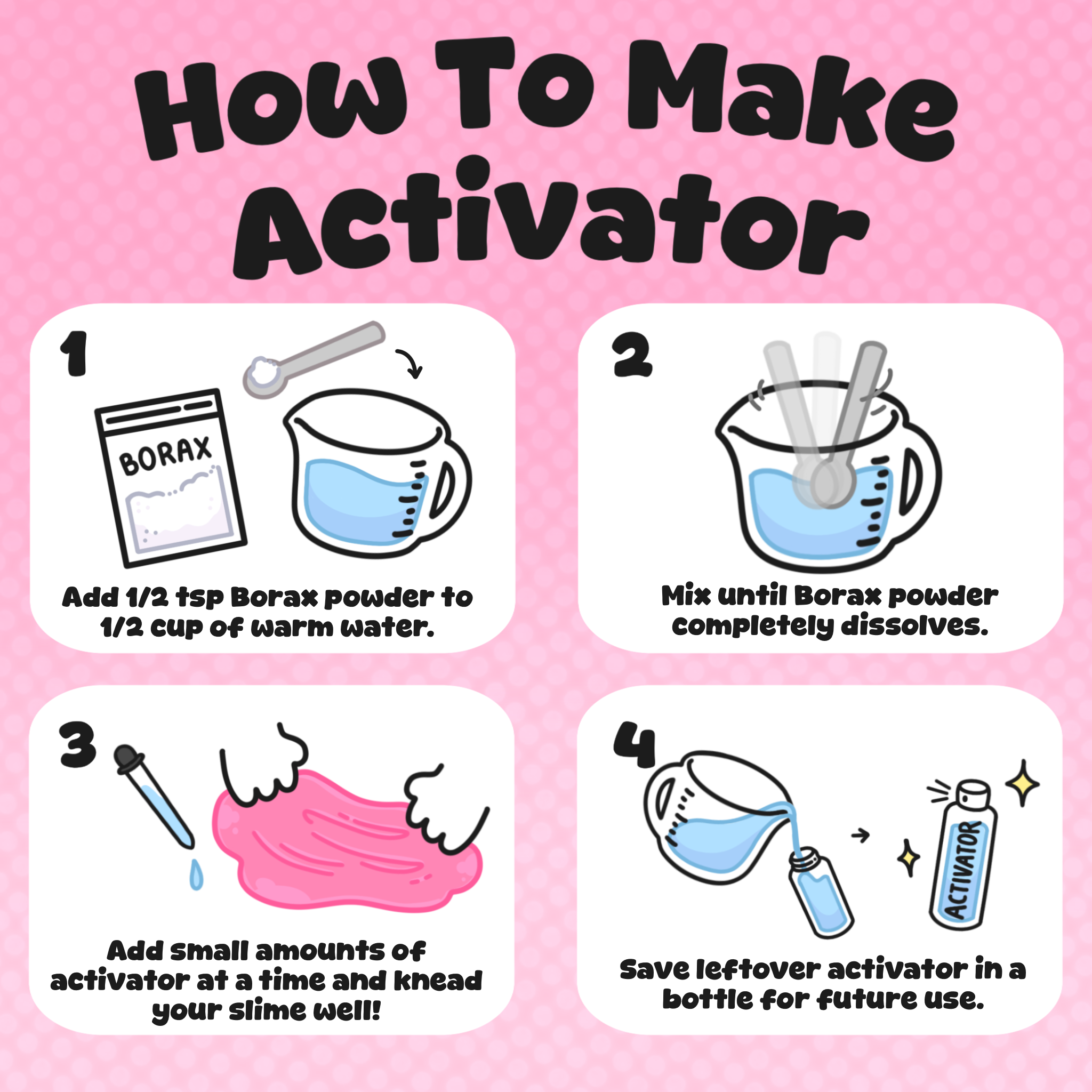 Every order will be provided with a bag of borax powder and instructions on creating a slime activator to fix sticky slime. Add a few drops of slime activator you’ve created into a sticky slime and knead until you reach your desired consistency. Make sure you don’t add too much activator at once to avoid over-activating your slime. Click here to watch a video on how to fix sticky slime!