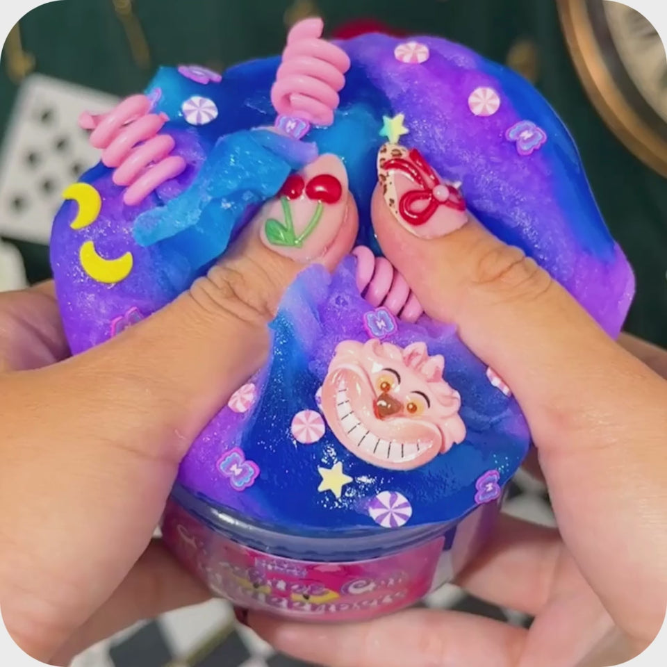 Texture: This slime features a hybrid jelly x icee with sponge cubes and comes with mischievous Cheshire Cat-themed add-ons! Once mixed together, the texture becomes soft, squishy, and perfect for bubble pops.